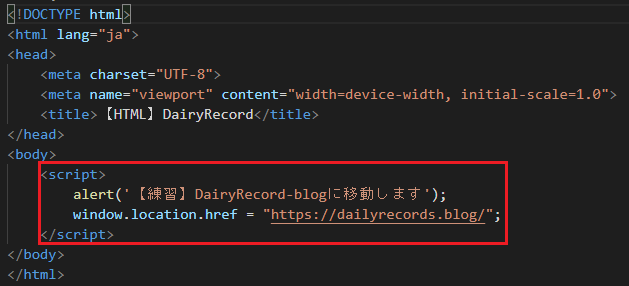 【JavaScript】リダイレクト(window.location.href) 投稿者: デイレコ | 2020年8月23日 0件のコメント window.location.href =””の中にリダイレクトさせたいurlを記入。 1234<script> alert('【練習】DairyRecord-blogに移動します'); window.location.href = "https://dailyrecords.blog/";</script> OKボタンを押したらリダイレクトされます。